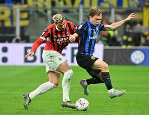 (250424) -- MILAN, 24 abril, 2025 (Xinhua) -- Imagen del 23 de abril de 2025 de Theo Hernández (i), de AC Milan, disputando con Nicolo Barella, de Inter de Milán durante el partido de fútbol de vuelta de la semifinal de la Copa Italiana, entre Inter de Milán y AC Milan, en Milán, Italia. (Xinhua/Alberto Lingria) (rtg) (ra) (vf)