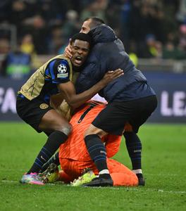 (250507) -- MILÁN, 7 mayo, 2025 (Xinhua) -- Imagen del 6 de mayo de 2025 de Denzel Dumfries (i), y el guardameta Yann Sommer (c), de Inter de Milán, festejando al término del partido de semifinal de vuelta de la Liga de Campeones de la UEFA entre Inter de Milán y Barcelona, en Milán, Italia. (Xinhua/Alberto Lingria) (ah) (ra) (ce)