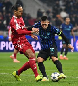 (251210) -- MILAN, 10 diciembre, 2025 (Xinhua) -- Imagen del 9 de diciembre de 2025 de Lautaro Martínez (d), de Inter Milan, disputando el balón con Virgil van Dijk, de Liverpool, durante el partido de la Liga de Campeones de la UEFA, entre Inter Milan y Liverpool, en Milán, Italia. (Xinhua/Alberto Lingria) (ah) (ra) (vf)