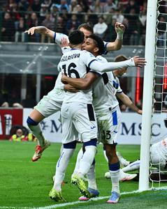 (250421) -- MILAN, 21 abril, 2025 (Xinhua) -- Imagen del 20 de abril de 2025 de Ederson (d), de Atalanta, festejando su anotación con sus compañeros durante el partido de fútbol de la Serie A entre AC Milan y Atalanta, en Milán, Italia. (Xinhua) (oa) (ah) (ce)