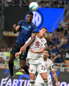 (250826) -- MILAN, 26 agosto, 2025 (Xinhua) -- Imagen del 25 de agosto de 2025 de Cesare Casadei (d), de Torino, disputando el balón con Denzel Dumfries, de Inter de Milán, durante un partido de fútbol de la Serie A entre Inter de Milán y Torino, en Milán, Italia. (Xinhua/Alberto Lingria) (jg) (ra) (vf)