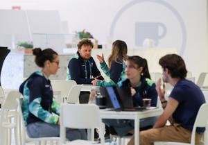 (260129) -- MILAN, 29 enero, 2026 (Xinhua) -- Imagen del 28 de enero de 2026 de personas conversando en el centro principal de medios de comunicación de los Juegos Olímpicos de Invierno Milán-Cortina 2026, en Milán, Italia. (Xinhua/Du Xiaoyi) (jg) (ah) (vf)