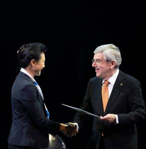 (250206) — MILAN, 6 febrero, 2025 (Xinhua) — El presidente del Comité Olímpico Internacional (COI), Thomas Bach (d), entrega la invitación a Li Lingwei, delegada del Comité Olímpico Nacional de China, en una ceremonia que marca el inicio de la cuenta regresiva de un año para Milán-Cortina 2026, en Milán, Italia, el 6 de febrero de 2025. (Xinhua/Li Jing) (jg) (ah) (vf)