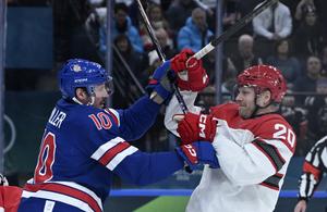 (260215) -- MILAN, 15 febrero, 2026 (Xinhua) -- Imagen del 14 de febrero de 2026 de JT Miller (i), de Estados Unidos, y Lars Eller, de Dinamarca, enfrentándose durante el partido del grupo C de la ronda preliminar masculina entre Estados Unidos y Dinamarca de hockey sobre hielo en los Juegos Olímpicos de Invierno Milán-Cortina 2026, en Milán, Italia. (Xinhua/Zhang Haofu) (oa) (da)