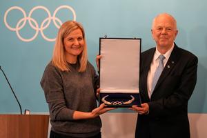 (260222) -- MILAN, 22 febrero, 2026 (Xinhua) -- La presidenta del Comité Olímpico Internacional (COI), Kirsty Coventry (i), entrega un premio a Olle Dahlin, presidente de la Unión Internacional de Biatlón durante una sesión del COI en los Juegos Olímpicos de Invierno Milán-Cortina 2026, en Milán, Italia, el 22 de febrero de 2026. (Xinhua/Luca Bruno/Pool) (rtg) (da)