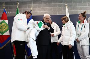 (260205) — MILAN, 5 febrero, 2026 (Xinhua) — El presidente italiano, Sergio Mattarella, se coloca una chamarra olímpica italiana durante su visita a la Villa Olímpica previo a los Juegos Olímpicos de Invierno Milán-Cortina 2026, en Milán, Italia, el 5 de febrero de 2026. (Xinhua/Yara Nardi/Pool) (rtg) (ra) (vf)
