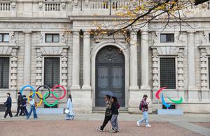(251030) -- MILAN, 30 octubre, 2025 (Xinhua) -- Imagen del 29 de octubre de 2025 de personas caminando frente a los emblemas de los Juegos Olímpicos y Paralímpicos frente al Ayuntamiento de Milán, en Milán Italia. Una ceremonia para marcar los 100 días para la inauguración de los Juegos Olímpicos de Invierno de Milán Cortina 2026 se llevó a cabo en el Palazzo Lombardia en Milán, en donde los organizadores develaron los podios oficiales de los Juegos Olímpicos y Paralímpicos y presentaron a 12 "portadores de la antorcha digital", que simboliza el inicio de la etapa final de los preparativos para el evento. (Xinhua/Li Jing) (rtg) (ra) (ce)