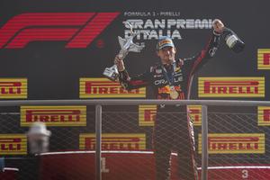 (250908) -- MILAN, 8 septiembre, 2025 (Xinhua) -- Imagen del 7 de septiembre de 2025 del piloto neerlandés de la escudería Red Bull, Max Verstappen, levantando el trofeo en el podio al término del Gran Premio de Italia de Fórmula Uno 2025, en el Autódromo Nacional de Monza, en Monza, cerca de Milán, Italia. (Xinhua/Qian Jun) (rtg) (ah) (vf)