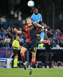 (251006) -- NAPOLES, 6 octubre, 2025 (Xinhua) -- Imagen del 5 de octubre de 2025 de Frank Anguissa (d), de Napoli, disputando el balón con Morten Frendrup, de Genoa durante el partido de la Serie A entre Napoli y Genoa, en Nápoles, Italia. (Xinhua) (rtg) (ah) (vf)