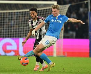 (251208) -- NAPOLES, 8 diciembre, 2025 (Xinhua) -- Imagen del 7 de diciembre de 2025 de Rasmus Hojlund (d), de Napoli, disputando el balón con Lloyd Kelly, de Juventus, durante un partido de la Serie A, entre Napoli y Juventus, en Nápoles, Italia. (Xinhua/Alberto Lingria) (rtg) (ah) (vf)