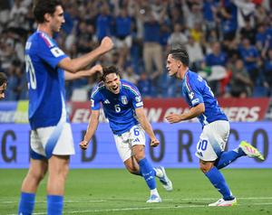 (250610) -- REGGIO EMILIA, 10 junio, 2025 (Xinhua) -- Imagen del 9 de junio de 2025 de Giacomo Raspadori (d), de Italia, festejando su anotación durante el partido de fútbol de las eliminatorias europeas para la Copa Mundial entre Italia y Moldavia, en Reggio Emilia, Italia. (Xinhua/Alberto Lingria) (oa) (ra) (vf)