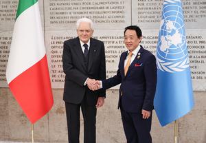 (251016) -- ROMA, 16 octubre, 2025 (Xinhua) -- El director general de la Organización de las Naciones Unidas para la Alimentación y la Agricultura (FAO, por sus siglas en inglés), Qu Dongyu (d), estrecha la mano del presidente italiano, Sergio Mattarella, durante el evento conmemorativo del Día Mundial de la Alimentación y el 80º aniversario de la FAO, en Roma, Italia, el 16 de octubre de 2025. (Xinhua/Li Jing) (jg) (ah) (ce)