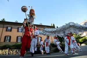 (251011) -- ROMA, 11 octubre, 2025 (Xinhua) -- Imagen del 10 de octubre de 2025 de entusiastas locales de la cultura china realizando la danza del dragón durante una feria de atracciones con temática del Festival de Medio Otoño en la Escuela Internacional Marymount, en Roma, Italia. La feria de atracciones se llevó a cabo aquí el viernes, donde estudiantes y residentes locales disfrutaron de una variedad de actividades y espectáculos culturales chinos presentados por entusiastas locales de la cultura china. (Xinhua/Li Jing) (jg) (da)