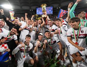 (250515) -- ROMA, 15 mayo, 2025 (Xinhua) -- Imagen del 14 de mayo de 2025 de jugadores de Bologna celebrando luego de ganar la final del partido de fútbol de la Copa Italiana entre AC Milan y Bologna, en Roma, Italia. (Xinhua/Alberto Lingria) (da) (vf)