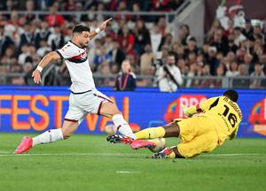 (250515) -- ROMA, 15 mayo, 2025 (Xinhua) -- Imagen del 14 de mayo de 2025 del guardameta Mike Maignan (d), de AC Milan, salvando el balón ante Riccardo Orsolini, de Bologna, durante la final del partido de fútbol de la Copa Italiana entre AC Milan y Bologna, en Roma, Italia. (Xinhua/Alberto Lingria) (da) (vf)