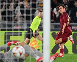 (250221) -- ROMA, 21 febrero, 2025 (Xinhua) -- Imagen del 20 de febrero de 2025 de Paulo Dybala (d), de Roma, festejando su segunda anotación durante el partido de fútbol de la Europa League de la UEFA, entre Roma y Porto, en Roma, Italia. (Xinhua/Augusto Casasol) (rtg) (ra) (vf)