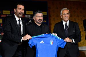 (250619) -- ROMA, 19 junio, 2025 (Xinhua) -- El presidente de la Federación Italiana de Fútbol, Gabriele Gravina (d), el nuevo director técnico de la selección nacional de fútbol de Italia, Gennaro Gattuso (c), y el exguardameta, Gianluigi Buffon, posan para una fotografía al término de una conferencia de prensa, en Roma, Italia, el 19 de junio de 2025. (Xinhua/Alberto Lingria) (rtg) (ra) (ce)