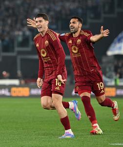 (250414) -- ROMA, 14 abril, 2025 (Xinhua) -- Imagen del 13 de abril de 2025 de Matias Soule (i), de Roma, festejando su anotación junto a su compañero, Zeki Celik, durante el partido de fútbol de la Serie A italiana entre Lazio y Roma, en Roma, Italia. (Xinhua/Alberto Lingria) (rtg) (ah) (ce)