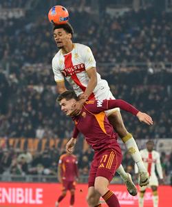 (251230) — ROMA, 30 diciembre, 2025 (Xinhua) — Imagen del 29 de diciembre de 2025 de Evan Ferguson (abajo), de Roma, disputando el balón con Sebastián Otoa, de Genoa, durante un partido de fútbol de la Serie A entre Roma y Genoa, en Roma, Italia. (Xinhua/Alberto Lingria) (oa) (ah) (vf)