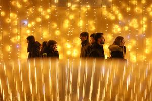 (251214) -- ROMA, 14 diciembre, 2025 (Xinhua) -- Imagen del 13 de diciembre de 2025 de personas caminando frente a las luces festivas cerca de la Plaza del Pueblo, en Roma, Italia. (Xinhua/Li Jing) (oa) (ah)
