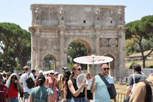 (250627) -- ROMA, 27 junio, 2025 (Xinhua) -- Turistas caminan cerca del Arco de Constantino, en Roma, Italia, el 27 de junio de 2025. El Ministerio de Salud de Italia emitió avisos consecutivos de alerta roja por calor para docenas de importantes ciudades de todo el país, a partir del 27 de junio y continuará durante el fin de semana. (Xinhua/Li Jing) (jg) (da) (vf)