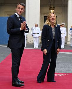 (250603) -- ROMA, 3 junio, 2025 (Xinhua) -- La primera ministra italiana, Giorgia Meloni (d), recibe al presidente francés, Emmanuel Macron, en el Palacio Chigi, en Roma, Italia, el 3 de junio de 2025. Meloni recibió el martes a Macron y ambos líderes sostuvieron conversaciones bilaterales sobre diversos temas, entre ellos el comercio, y las relaciones con Estados Unidos, según medios italianos. (Xinhua/Alberto Lingria) (oa) (ra) (vf)
