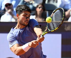 (250517) -- ROMA, 17 mayo, 2025 (Xinhua) -- Imagen del 16 de mayo de 2025 de Carlos Alcaraz devolviendo la pelota durante el partido de semifinal de individuales masculinos entre Carlos Alcaraz, de España, y Lorenzo Musetti, de Italia, en el Abierto de Italia de la ATP, en Roma, Italia. (Xinhua/Alberto Lingria) (rtg) (da)