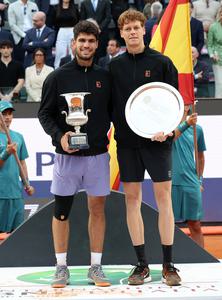 (250519) -- ROMA, 19 mayo, 2025 (Xinhua) -- Imagen del 18 de mayo de 2025 de Carlos Alcaraz (i), de España, y Jannik Sinner, de Italia, posando con sus trofeos al término del partido final de individuales masculinos, en el Abierto de Italia de la ATP, en Roma, Italia. (Xinhua/Elisa Lingria) (oa) (ah) (ce)