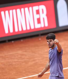 (250515) -- ROMA, 15 mayo, 2025 (Xinhua) -- Imagen del 14 de mayo de 2025 de Carlos Alcaraz reaccionando luego de ganar el partido de cuartos de final de individuales masculinos entre Jack Draper, de Reino Unido, y Carlos Alcaraz, de España, en el Abierto de Italia de la ATP, en Roma, Italia, el 13 de mayo de 2025. (Xinhua/Li Jing) (da) (ra) (vf)