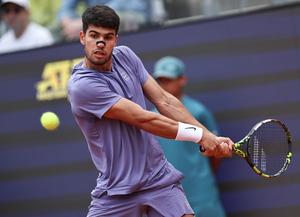 (250515) -- ROMA, 15 mayo, 2025 (Xinhua) -- Imagen del 14 de mayo de 2025 de Carlos Alcaraz devolviendo la pelota durante el partido de cuartos de final de individuales masculinos entre Jack Draper, de Reino Unido, y Carlos Alcaraz, de España, en el Abierto de Italia de la ATP, en Roma, Italia, el 13 de mayo de 2025. (Xinhua/Li Jing) (da) (ra) (vf)