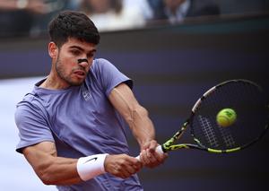 (250515) -- ROMA, 15 mayo, 2025 (Xinhua) -- Imagen del 14 de mayo de 2025 de Carlos Alcaraz devolviendo la pelota durante el partido de cuartos de final de individuales masculinos entre Jack Draper, de Reino Unido, y Carlos Alcaraz, de España, en el Abierto de Italia de la ATP, en Roma, Italia, el 13 de mayo de 2025. (Xinhua/Li Jing) (da) (ra) (vf)