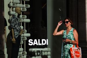 (250706) -- ROMA, 6 julio, 2025 (Xinhua) -- Imagen del 5 de julio de 2025 de una mujer caminando frente a un escaparate, en Roma, Italia. Las rebajas de verano en Italia comenzaron el sábado y durarán entre seis y ocho semanas. (Xinhua/Li Jing) (oa) (da)