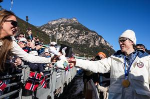 (260215) -- TESERO, 15 febrero, 2026 (Xinhua) -- Johannes Hoesflot Klaebo (d), de Noruega, entregando la mascota a una aficionada después de la ceremonia de premiación del relevo 4x7,5 km masculino de esquí de fondo en los Juegos Olímpicos de Invierno Milán-Cortina 2026, en Tesero, Italia, el 15 de febrero de 2026. (Xinhua/Peng Ziyang) (rtg) (ah)
