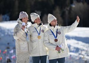 (260213) -- TESERO, 13 febrero, 2026 (Xinhua) -- El medallista de oro, Johannes Hoesflot Klaebo (c), de Noruega, el medallista de plata, Mathis Desloges (i), de Francia, y el medallista de bronce, Einar Hedegart, de Noruega, posan para fotografías durante la ceremonia de premiación de la salida masiva libre por intervalos de 10 km masculina de esquí de fondo en los Juegos Olímpicos de Invierno Milán-Cortina 2026, en Tesero, Italia, el 13 de febrero de 2026. (Xinhua/He Canling) (rtg) (ra) (vf)