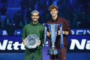 (251117) -- TURIN, 17 noviembre, 2025 (Xinhua) -- Imagen del 16 de noviembre de 2025 de Jannik Sinner y Carlos Alcaraz posando para una fotografía al término del partido final de individuales masculinos entre Jannik Sinner, de Italia, y Carlos Alcaraz, de España, en el torneo de tenis ATP Finals, en Turín, Italia. (Xinhua/Li Jing) (oa) (ah) (vf)