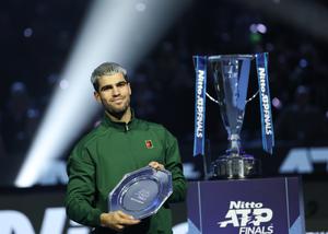 (251117) -- TURIN, 17 noviembre, 2025 (Xinhua) -- Imagen del 16 de noviembre de 2025 de Carlos Alcaraz posando para una fotografía al término del partido final de individuales masculinos entre Jannik Sinner, de Italia, y Carlos Alcaraz, de España, en el torneo de tenis ATP Finals, en Turín, Italia. (Xinhua/Li Jing) (oa) (ah) (vf)