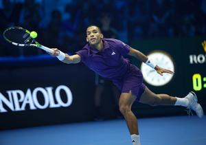 (251116) -- TURIN, 16 noviembre, 2025 (Xinhua) -- Imagen del 15 de noviembre de 2025 de Felix Auger-Aliassime devolviendo la pelota durante el partido semifinal de individuales masculinos entre Carlos Alcaraz, de España, y Felix Auger-Aliassime, de Canadá, en el torneo de tenis ATP Finals, en Turín, Italia. (Xinhua/Li Jing) (oa) (ah)