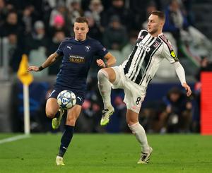 (251211) -- TURIN, 11 diciembre, 2025 (Xinhua) -- Imagen del 10 de diciembre de 2025 de Teun Koopmeiners (d), de Juventus, disputando el balón con Mislav Orsic, de Pafos, durante el partido de la Liga de Campeones de la UEFA, entre Juventus y Pafos, en Turín, Italia. (Xinhua/Alberto Lingria) (rtg) (ra) (vf)