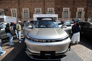 (250928) -- TURIN, 28 septiembre, 2025 (Xinhua) -- Imagen del 27 de septiembre de 2025 de visitantes experimentando automóviles exhibidos de Geely, en el Salón del Automóvil de Turín, en Turín, Italia. Diecisiete fabricantes chinos trajeron sus nuevos modelos al Salón del Automóvil de Turín este año, casi un tercio de todos los expositores. (Xinhua/Li Jing) (rtg) (ah)
