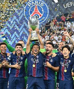 (250814) -- UDINE, 14 agosto, 2025 (Xinhua) -- Imagen del 13 de agosto de 2025 de jugadores de Paris Saint-Germain festejando durante la ceremonia de victoria al término del partido de fútbol de la final de la Super Copa de la UEFA 2025 entre Paris Saint-Germain, de Francia, y Tottenham Hotspur, de Inglaterra, en Udine, Italia. (Xinhua/Alberto Lingria) (rtg) (ra) (ce)