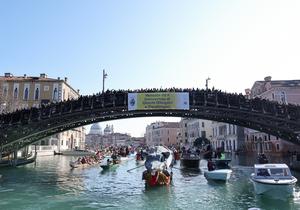 (260202) — VENECIA, 2 febrero, 2026 (Xinhua) — Imagen del 1 de febrero de 2026 de un letrero en el que se lee «Venecia recibe a los Juegos Olímpicos y Paralímpicos» visto en el Puente de la Academia, durante el desfile acuático del Carnaval de Venecia, en Venecia, Italia. La edición de 2026 del tradicional Carnaval de Venecia se celebra del 31 de enero al 17 de febrero. (Xinhua/Li Jing) (rtg) (ah) (vf)