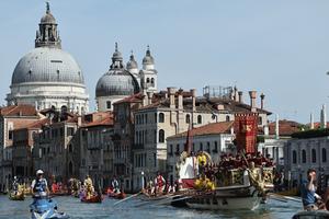 (250908) -- VENECIA, 8 septiembre, 2025 (Xinhua) -- Imagen del 7 de septiembre de 2025 de venecianos portando trajes para el desfile histórico de la Regata Histórica, en Venecia, Italia. La Regata Histórica es un desfile anual de botes y una carrera de remo en el Gran Canal de Venecia. (Xinhua/Li Jing) (oa) (ah) (ce)