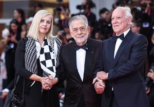 (250828) -- VENECIA, 28 agosto, 2025 (Xinhua) -- Imagen del 27 de agosto de 2025 del director alemán, Werner Herzog (d), y el director estadounidense, Francis Ford Coppola (c), llegando a la alfombra roja de la ceremonia inaugural del 82° Festival de Cine de Venecia, en Venecia, Italia. Herzog recibió el premio León de Oro a la Trayectoria del festival de cine en la ceremonia inaugural. (Xinhua/Li Jing) (jg) (ah) (vf)