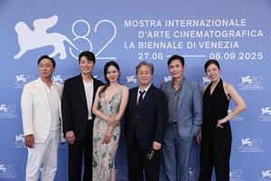 (250829) -- VENECIA, 29 agosto, 2025 (Xinhua) -- El reparto principal de la película "No Other Choice" posa para una sesión fotográfica durante el 82° Festival de Cine de Venecia, en Venecia, Italia, el 29 de agosto de 2025. (Xinhua/Li Jing) (oa) (ra) (ce)