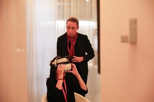 (250906) -- VENECIA, 6 septiembre, 2025 (Xinhua) -- Imagen del 4 de septiembre de 2025 de una visitante experimentando la película The Big Cube en el área de proyección de la sección Venecia Inmersiva del 82º Festival de Cine de Venecia, en Venecia, Italia. (Xinhua/Li Jing) (oa) (da)