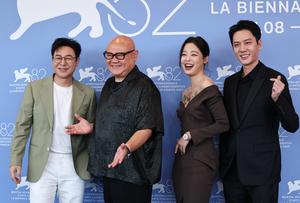(250906) -- VENECIA, 6 septiembre, 2025 (Xinhua) -- Imagen del 5 de septiembre de 2025 de Cai Shangjun (2-i), director de la película "The Sun Rises On Us All", posando para una sesión fotográfica con los miembros del reparto de la película, Zhang Songwen (i), Xin Zhilei (2-d) y Feng Shaofeng durante el 82º Festival de Cine de Venecia, en Venecia, Italia. (Xinhua/Li Jing) (rtg) (da)