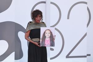 (250904) -- VENECIA, 4 septiembre, 2025 (Xinhua) -- Imagen del 3 de septiembre de 2025 de la directora Kaouther Ben Hania, de la película "The Voice of Hind Rajab", posando con la fotografía de Hind Rajab en la alfombra roja del estreno durante el 82º Festival de Cine de Venecia, en Venecia, Italia. (Xinhua/Li Jing) (jg) (ah)