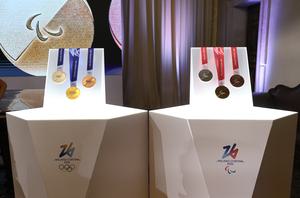 (250716) -- VENECIA, 16 julio, 2025 (Xinhua) -- Imagen del 15 de julio de 2025 de las medallas de los Juegos Olímpicos y Paralímpicos de Invierno Milán Cortina 2026 exhibidas durante la ceremonia de presentación en el Palacio Balbi, en Venecia, Italia. (Xinhua/Li Jing) (ah) (ra) (vf)