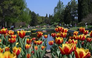 (250405) -- VERONA, 5 abril, 2025 (Xinhua) -- Imagen del 4 de abril de 2025 de personas caminando entre las flores en el Parco Giardino Sigurtà, en Valeggio sul Mincio, Verona, Italia. (Xinhua/Alberto Lingria) (oa) (da)