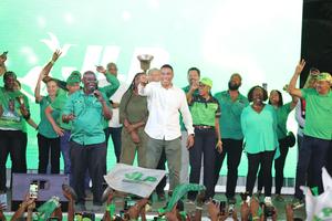 (250904) -- KINGSTON, 4 septiembre, 2025 (Xinhua) -- Imagen del 3 de septiembre de 2025 de Andrew Holness (c), primer ministro jamaicano y líder del gobernante Partido Laborista de Jamaica (JLP, por sus siglas en inglés), celebrando la victoria, en Kingston, capital de Jamaica. El primer ministro jamaicano, Andrew Holness, fue reelegido para cumplir un tercer mandato tras las elecciones generales celebradas el miércoles en la isla, según los resultados preliminares publicados por la oficina electoral del país. (Xinhua/Li Mengxin) (da) (ra) (ce)